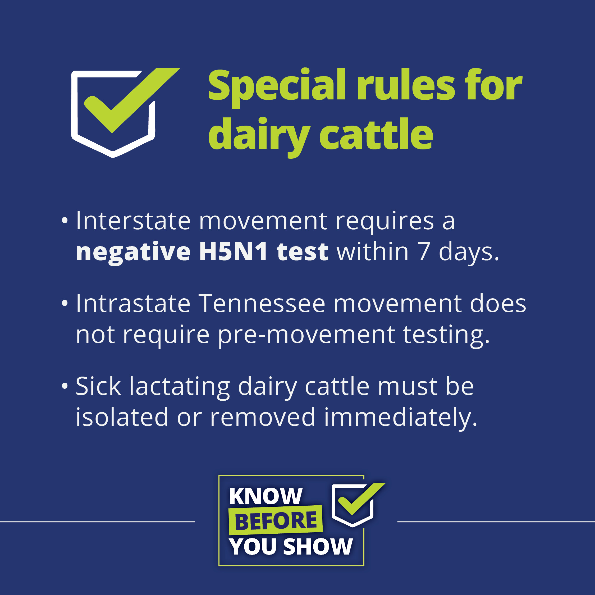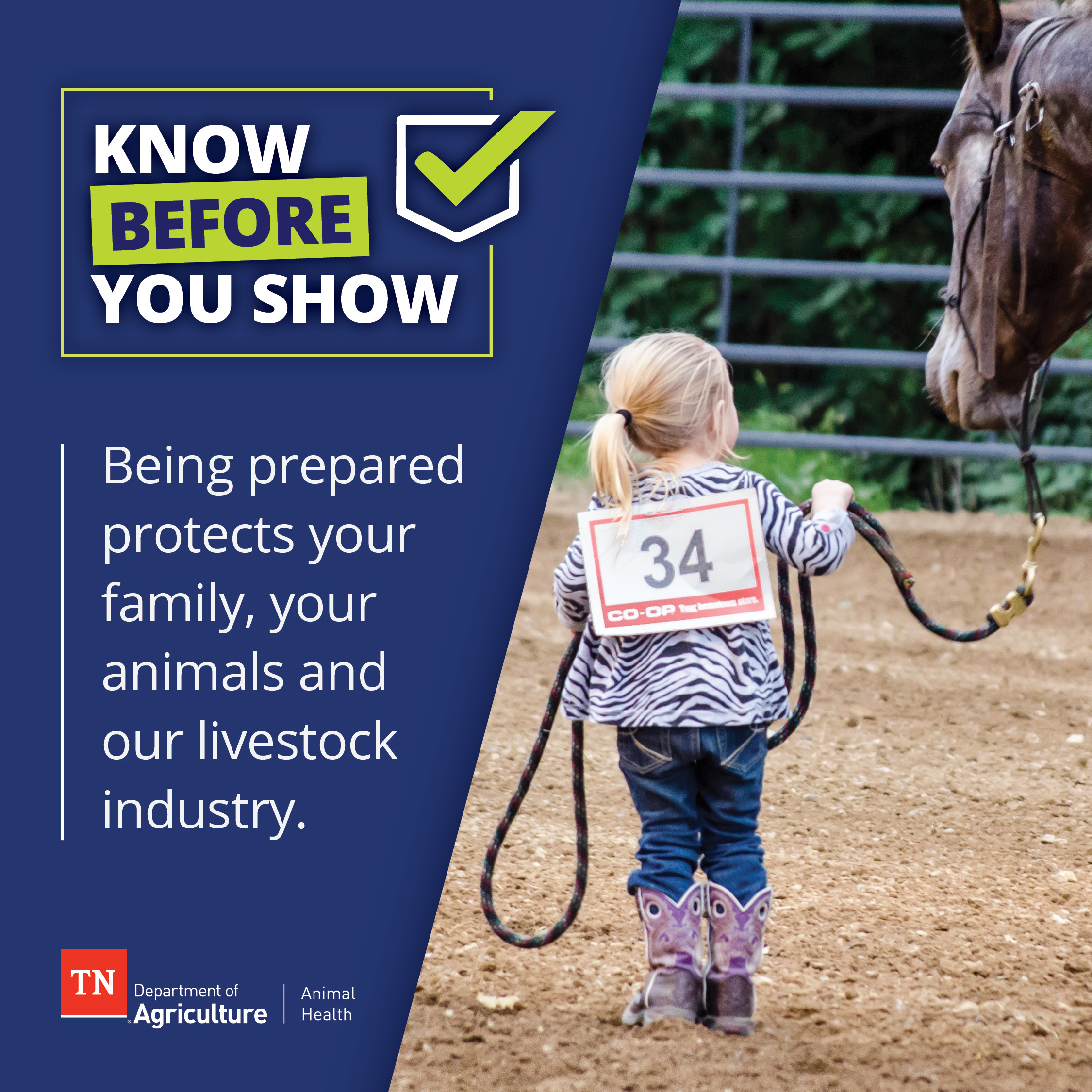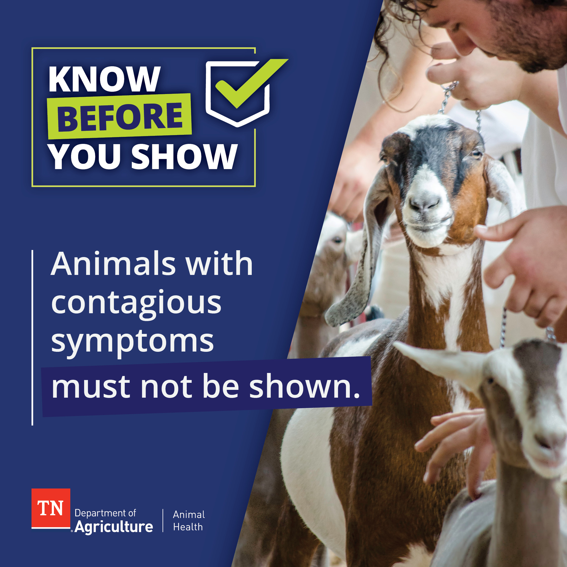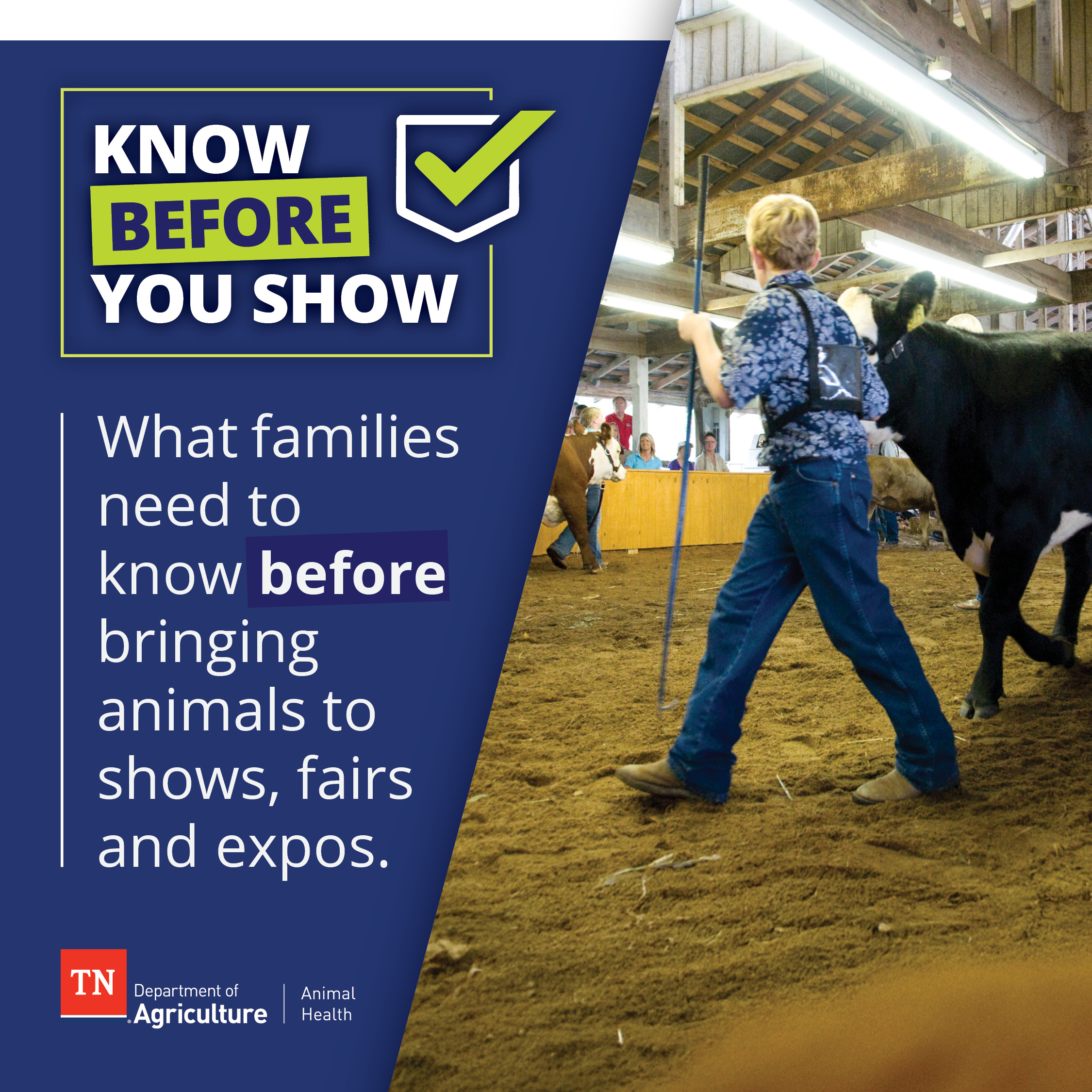 To promote the health of livestock in Tennessee and beyond, the Tennessee Department of Agriculture has partnered with the UT Extension Service to provide the following flyers to outline health requirements and recommendations for livestock participating in fairs, shows, and exhibitions. Please feel free to download, print, and share.