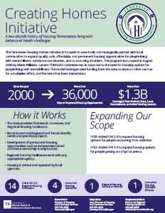 Today, along with the Director of Regional Housing Facilitators, there are seven Regional Housing Facilitators and seven CHI 2.0 Regional Substance Use Housing Facilitators who work in collaboration with a vast array of community partners, including the Continua of Care, to create and develop safe, affordable, quality, permanent housing options for persons diagnosed with a mental illness and/or substance use disorder along a continuum from 24/7 supervised living facilities to home ownership. Through state FY24, the Creating Homes Initiative has leveraged more than $1.3 billion to create more than 36,000 new housing opportunities across Tennessee.