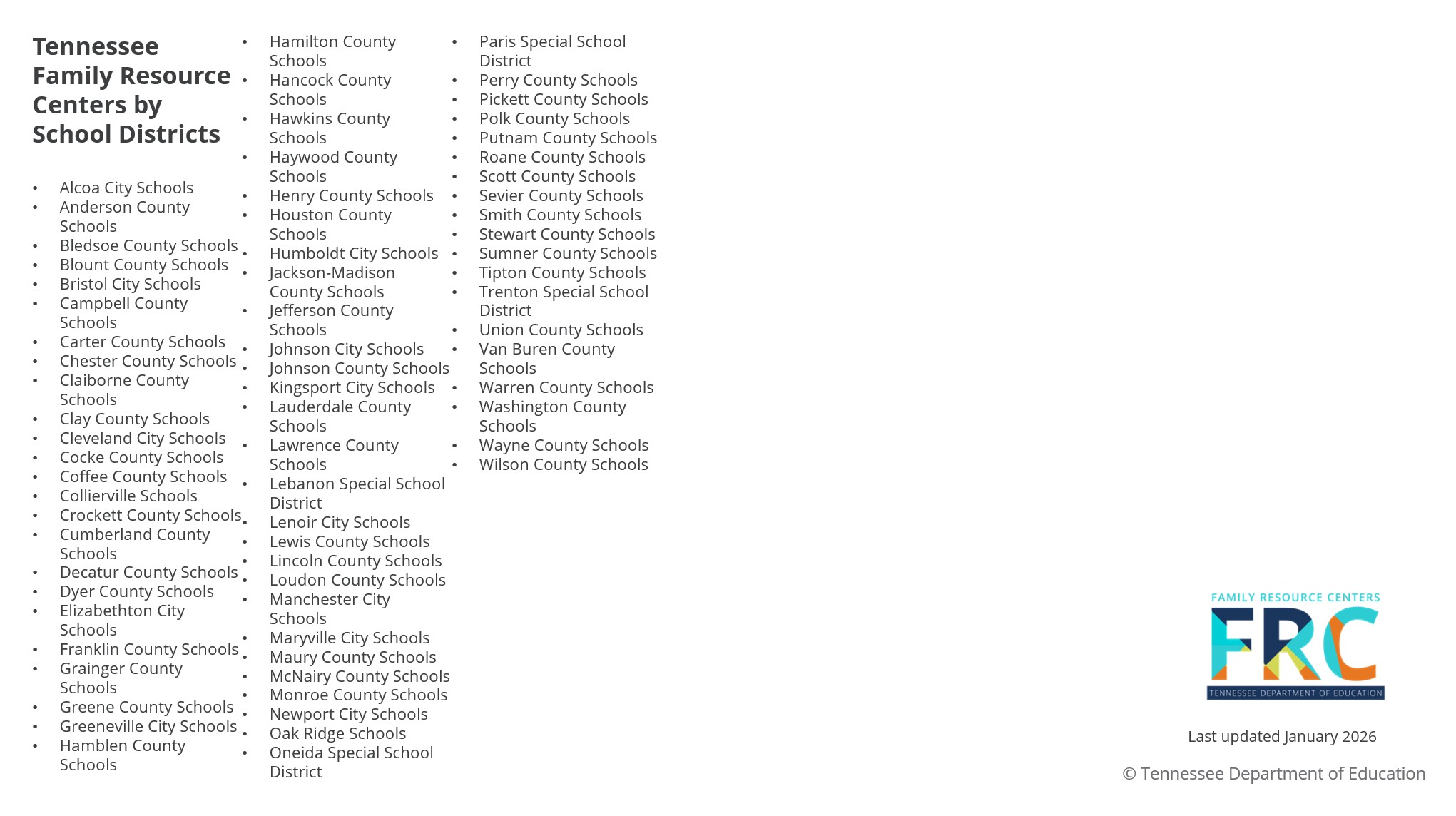 Tennessee Family Resource Centers unlock potential by serving as a resource and support hub.. FRCs proactively engage with their communities to empower students and families, bridging gaps to ensure they evolve together through connected systems of support unique to each community.