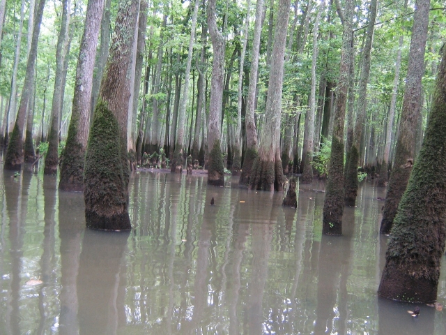 The Ghost River section of the Wolf River received its name from the loss of river current as the water “flows” through open marshes and bald cypress-water tupelo swamps. Blue trail markers show the way for paddlers through the disorienting maze of willow, cypress, tupelo, and stunted pumpkin ash. The marked canoe trail follows the river from Yager Road in LaGrange to Bateman Road Bridge. A loop trail and 600-ft boardwalk crossing Mineral Slough was completed in 2004.