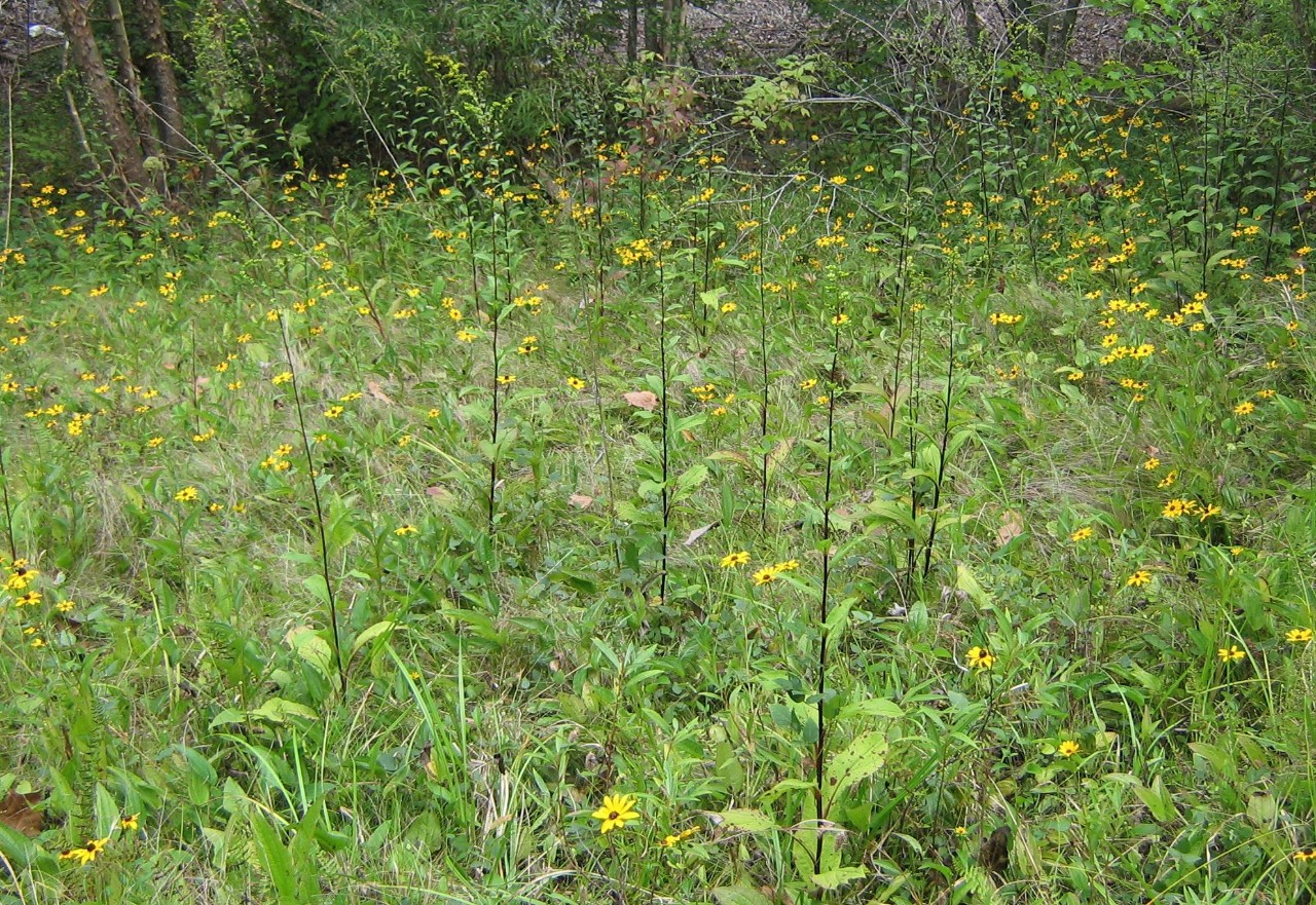 Langford Branch is a small hilly area that is mostly under an oak-hickory forest canopy. The steepest slopes support a good example of a small barrens grassland community with little bluestem and many species of legumes and sunflowers present. These steep slopes are underlain by cherty Fort Payne limestone outcropping with eastern red cedar, post oak, and few other tree species growing where soils permit. The seep community occurs in an open area and is referred to as a Parnassia seep. The rare state-listed Grass of Parnassas (Parnassia grandifolia) covers large areas of the seep. It is easy to identify because of its large round shaped leaves. The rare shorted-headed rush (Juncus brachycephalus) also occurs in this seep. This Parnassia seep community is ranked as a globally rare community type.