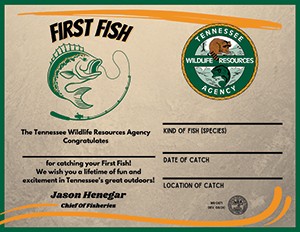 The First Fish Award is designed to commemorate that special moment in everybody's life-the landing of their first fish. The award recognizes this special moment with a frameable certificate identifying the angler, the fish caught, and other details of that moment. The size of the fish and age of the angler have no bearing, only that the fish is their first, and that it was caught in Tennessee.