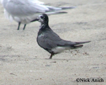 The Black Tern is a small, dark, graceful tern of freshwater marshes and lakes. These birds breed in the upper Midwest, Great Lakes area, and southern Canada while wintering on the northern coast of South America and the Pacific coast of Mexico. Black terns are readily identified in spring when they are in their brilliant black plumage, and in fall with their buoyant, bouncy, and erratic flight with deep wing beats and mottled black and white plumage.