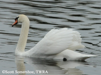 As an exotic, feral species, the Mute Swan has had significant effects on the ponds and lakes they inhabit. Potential effects range from overgrazing of aquatic vegetation to displacing native waterfowl. A large white swan, generally unmistakable in Tennessee. Distinguished from other swans by its long, S-curved neck and its orange red bill with a large, black, basal knob.