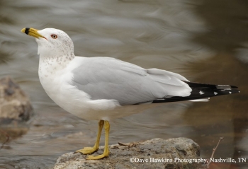 The Ring-billed Gull is a medium-sized, white-headed, primarily inland nesting North American gull that frequents garbage dumps, parking lots, and southern coastal beaches in large numbers during the winter. It is Tennessee's most common wintering gull, arriving in late September and departing by early May.