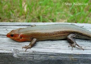 The Broad-headed Skink is the largest skink in Tennessee and can be found across the state, except for the extreme northeastern corner. It is a large, smooth-scaled lizard (6.5 to 12.5 inches in length) with short legs and a stocky body. Adult males, the namesake of this species, are olive-brown with large, swollen red heads during the breeding season. Adult females are variable, but usually have up to 5 light or faded stripes on a brownish body. Juveniles have 5 distinct, light colored stripes on a black background with a bright blue tail.