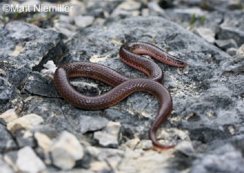 Two subspecies are recognized in Tennessee: the Eastern Wormsnake (C. a. amoenus) and Midwestern Wormsnake (C. a. helenae). The Eastern Wormsnake occurs in the Great Valley and Unaka Mountains of east Tennessee, while the Midwestern Wormsnake occurs across the rest of the state. It is a small, shiny, smooth-scaled snake (7.5 to 11.0 inches in length) with a sharp contrast between brown back and pink belly; often having an iridescent sheen. The head is small and pointed with tiny eyes, and the tail is short and pointed. The young are darker and smaller. The Eastern Wormsnake has separate prefrontal and intranasal scales (scales between nose and eyes), while the Midwestern Wormsnake’s are fused.