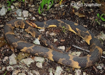 Similar Species: Cottonmouths are darker and more heavy-bodied with a facial pit between the eye and nostril.