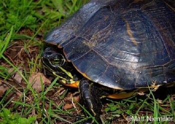 A medium-sized, aquatic turtle (adults average 5.0 to 8.0 inches in length, max 11.5+ inches, but bigger ones have been reported) with a carapace (upper shell) ranging from dark green to brown to almost black with yellowish markings. Head, neck, and limbs are striped yellow over a green or brownish skin. The lower jaw is rounded rather than flattened. Plastron (lower shell) is yellow, with each plate usually having a dark spot.
