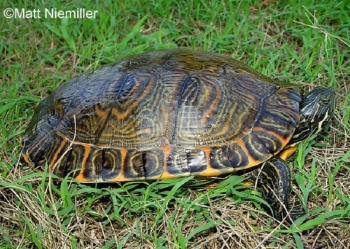 Similar Species: False Map Turtle has a backward, yellow “L” mark behind the eyes. Mississippi Map Turtle has a yellow crescent behind the eye. Northern Map Turtle has a small spot behind the eye. Painted Turtle has red coloration on the shell. Pond Slider has a large red (or sometimes yellow) ear patch and leg stripes. Ouachita Map Turtle has a large rectangular patch behind the eye and has a keel.