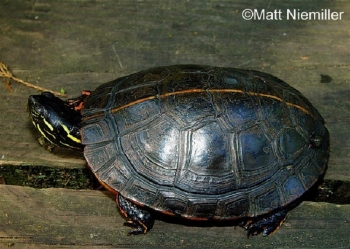 Similar Species: The Painted Turtle usually lacks the broad red or orangish stripe running down the center of the back, but genetic analysis is required to positively distinguish it from the Southern Painted Turtle.