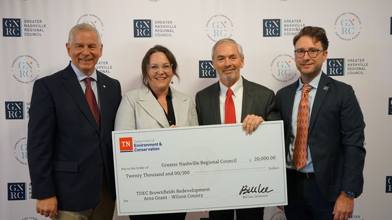 The Tennessee Department of Environment and Conservation (TDEC) presents a check for $20,000 to Wilson County for its plans in brownfield redevelopment. From left are Joe Pitts, mayor of Clarksville and chair of the Greater Nashville Regional Council; Tara Pedraza, director of Stakeholder Engagement for TDEC; Randall Hutto, mayor of Wilson County; and Michael Skipper, executive director of the Greater Nashville Regional Council.
