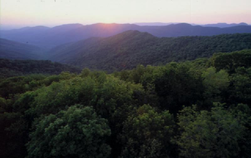 The lowest elevation is at the Flat Fork access at 1,340 feet. The deep hollows and valleys here provide rich forest habitats and forest community types. Those most prevalent are the many different mixed mesophytic forest communities that include hemlock, white pine, tulip poplar, sugar and red maples, many species of oaks and hickories, yellowwood, yellow birch, ash, walnut, blackgum, beech, sourwood, basswood, magnolias, and black cherry. A mesic oak forest occurs as basswood and buckeye begin to dropout on the mid and upper slopes. White oak becomes the dominant tree here along with tulip poplar and other species commonly found in the mixed mesophytic forest. At higher elevations and on dry slopes and ridges, scarlet and chestnut oaks become more common along with shortleaf pine.