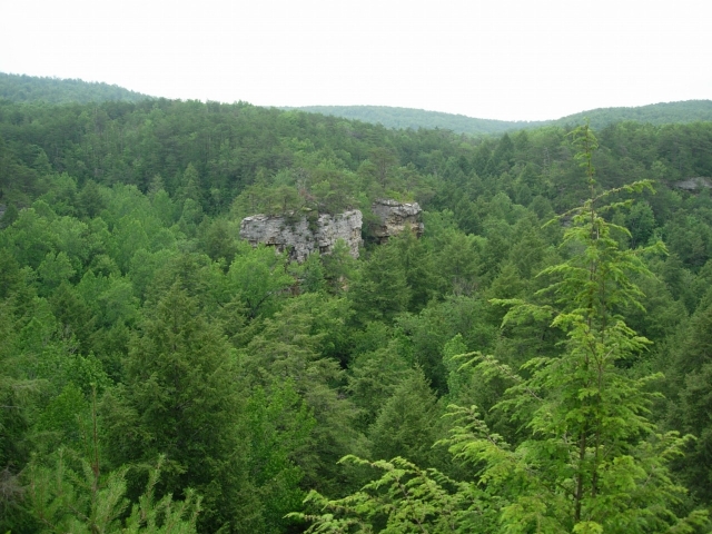 A dry, oak-pine woodland surrounds the Chimneys on the surrounding bluffs. Chestnut oak and Virginia pine are common to this area. Maple-leaf viburnum and sweet-shrub are also often found in areas like this. Small pockets of glade and barrens vegetation can be found in a few areas with shallow soil on dry upper bluffs. There is an old growth hemlock forest in the gorge comprised of densely forested hemlock, chestnut oak, magnolia or cucumber tree, and striped maple. A thicket of rosebay rhododendron grows along the creek, making passage to the base of the Chimneys challenging. There are numerous ferns and mosses covering sandstone talus boulders at the base of the steep slopes. Some of the steepest slopes are wet seep cliffs that support a diversity of mosses, liverworts, and other plants not found elsewhere on the site.