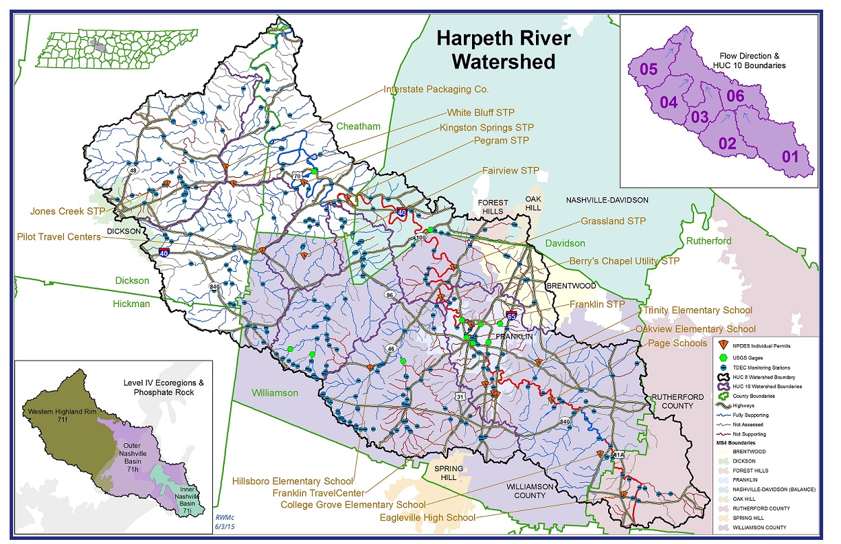 The Harpeth River Watershed is located in Middle Tennessee and includes parts of Cheatham, Davidson, Dickson, Hickman, Rutherford, and Williamson Counties. The Harpeth River Watershed is approximately 863 square miles and drains to the Cumberland River.