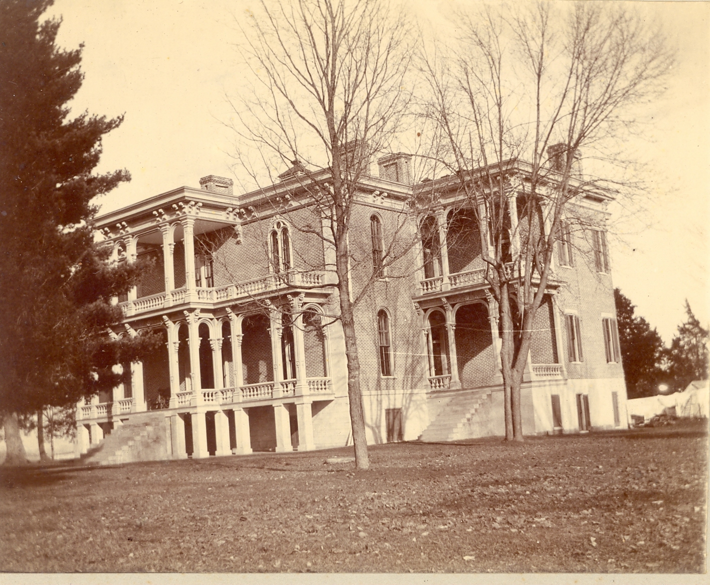 Many of the buildings still standing at Clover Bottom were built during the Hoggatt’s tenure, including Clover Bottom Mansion. The mansion was originally constructed in 1853 in the Greek Revival style, which the enslaved people called the “White House.” In February 1859, the mansion burned, leaving only the masonry exterior walls and chimneys. The process of rebuilding began immediately with hired craftsmen and carpenters from Nashville. The Hoggatts decided to have their new house built in the fashionable Italianate style. Rather than the Greek Revival-style portico supported by large columns of their previous house (the remnants of which still remain in the front lawn), their new house had an ornate portico with detailed moldings and brackets. A side addition was built soon after, bringing the mansion to its present form.