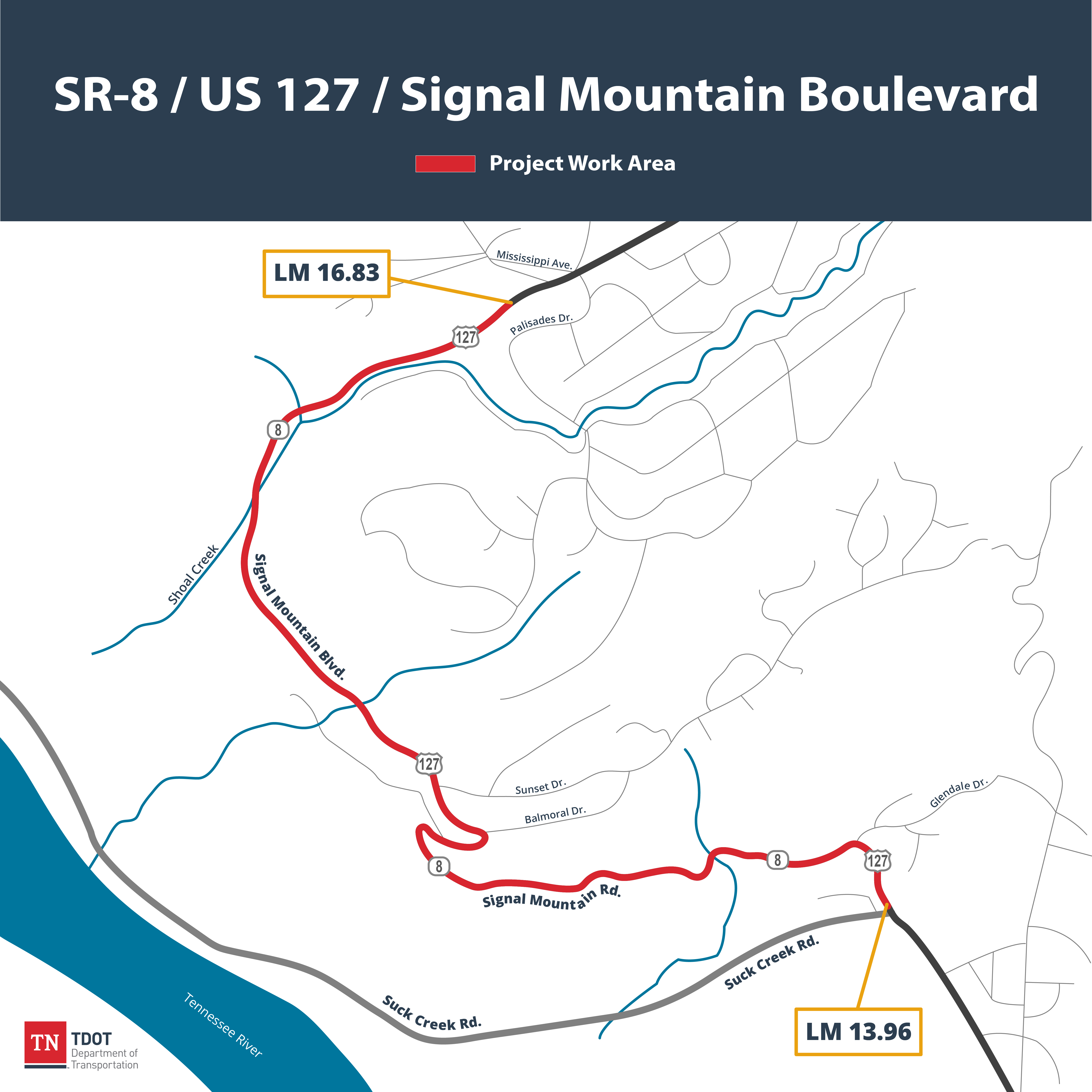 The Tennessee Department of Transportation (TDOT) is proposing to conduct spot improvements along Signal Mountain Boulevard (State Route 8, US 127). The proposed project includes repairs and upgrades to drainage systems, slope stabilization at various locations and rock fall mitigation. These improvements will reduce potential roadway failures and improve drainage, making Signal Mountain Boulevard a safer and more reliable route.