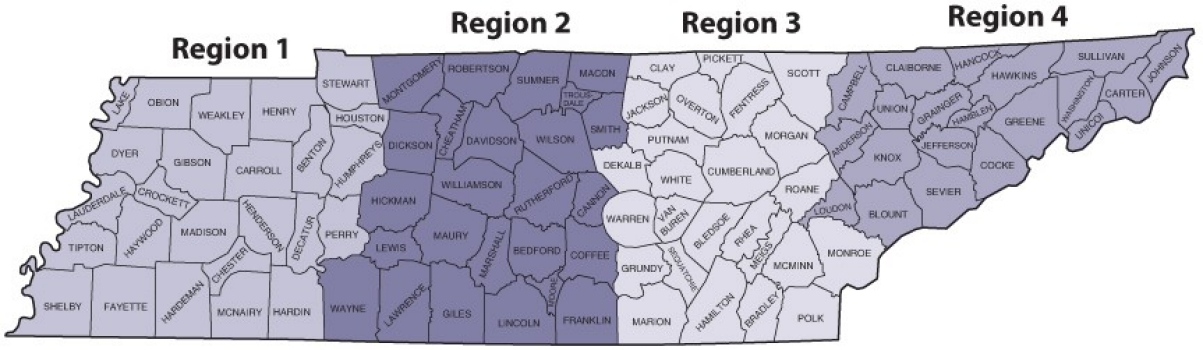 | West Tennessee - Region I | Middle Tennessee - Region II | Cumberland Plateau - Region III | East Tennessee - Region IV |