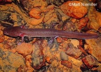 The Berry Cave Salamander is found in only 3 counties (Knox, McMinn, and Roane) of the Ridge and Valley Province in east TN. Formerly a subspecies of Tennessee Cave Salamander (G. palleucus). A long-bodied salamander (4.0 to 9.0 inches in length) with small eyes, a lack of eyelids, a wide head, a spatulate snout, and bright red, feathery, external gills. Overall coloration is salmon to pale pink with a pale belly. Also, has a unique dark stripe on the forward half of the throat.