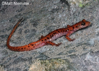 The Cave salamander occurs in caves in the karst topography of the eastern two-thirds of Tennessee. This salamander is long (4.0 to 6.0 inches in length), bright orange to reddish in color, with black spots scattered over the body, legs, and tail. The belly is yellow and unmarked.
