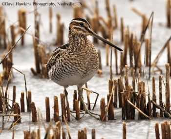 Formerly known as the Common Snipe, snipe that breed in North America are now considered a separate species called the Wilson's Snipe. This small, chunky, long-billed shorebird spends the non-breeding season in Tennessee. It can be found alone or in small groups across the state, probing in mud and wet meadows for small invertebrates. However, its camouflage coloration is so good that it is often overlooked until flushed, when it rapidly flies away in a zigzag pattern, uttering its raspy scaipe call.