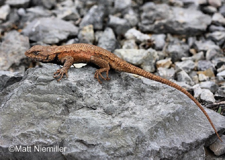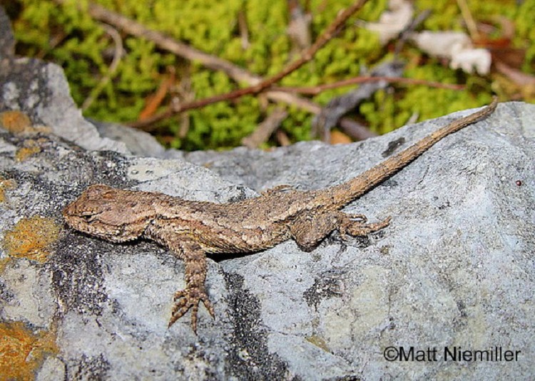 The Eastern Fence Lizard occurs statewide and is the only spiny lizard in Tennessee. A medium-sized (4.0 to 7.25 inches in length), wide-bodied grayish to brown lizard with keeled, pointed scales. Females are larger than males and have dark, wavy lines across the back, while males are more uniformly colored. Adult males have bright blue patches, bordered with black, along the throat and belly.