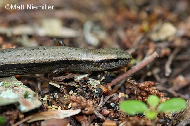 The Little Brown Skink, also known as Ground Skink or “brown-backed skink.” Found across the state, except for the extreme northeastern corner. It is a small, slender lizard (3.0 to 5.25 inches in length) with smooth, shiny scales and short legs. Background color is variable, but usually golden brown to dark brown with dark stripes running down the side of the back from eye to mid-tail. Small black specks typically dot the back and sides. Adult males have yellow bellies; adult females have white or gray bellies and are larger. Juveniles are similar to adults.