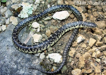 Three subspecies occur in the state: Eastern Kingsnake (L. g. getula) is found in extreme southeastern Tennessee, Eastern Black Kingsnake (L. g. nigra) occurs over most of Tennessee except the northeastern corner, and Speckled Kingsnake (L. g. holbrooki) is found in the western and southwestern third of Tennessee, where it interbreeds with Eastern Black Kingsnake. A large, shiny, black constrictor (36.0 to 48.0 inches in length) with varying yellow or white bands or speckles among the subspecies. Eastern Kingsnake has narrow, light yellowish crossbands that create a chainlike pattern.