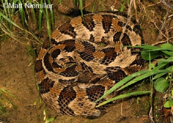 Habitat: Prefers mature, heavily wooded forests with rocky, south-facing hillsides; often associated with bluffs or ledges. They can also be found around mountains, swamps, cane thickets, wooded stream corridors, and rural habitats. It is common to see Timber Rattlesnakes coiled near fallen logs or sunning on rocks.
