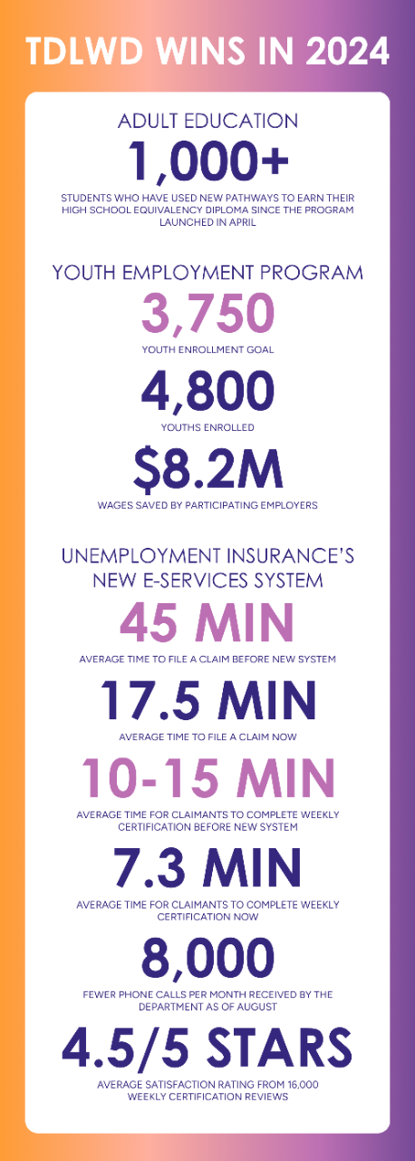 As 2024 comes to a close, the Tennessee Department of Labor and Workforce Development (TDLWD) is celebrating three big wins this year that have improved the lives of residents across the state.